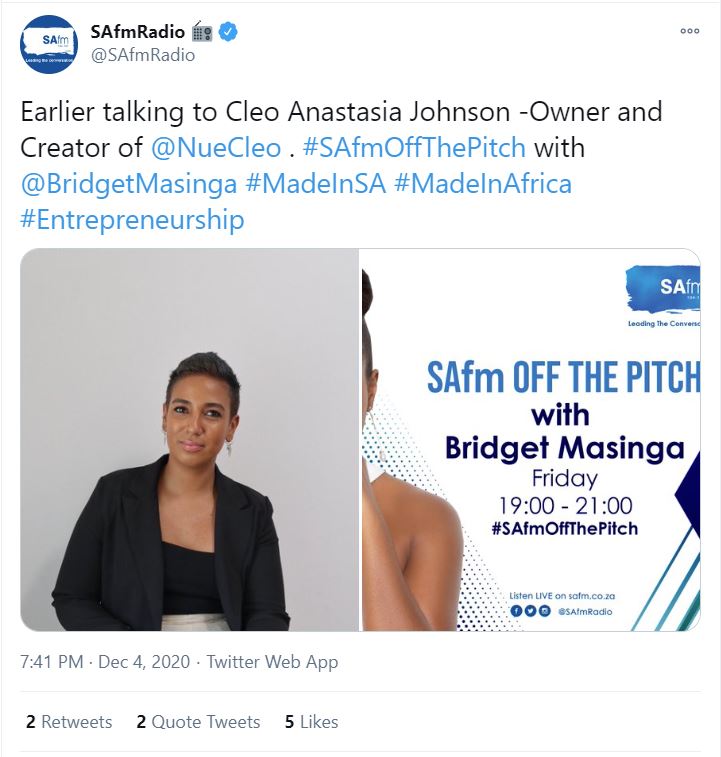 Following her Mail & Guardian award, Bridget Masinga interviews Cleo Johnson for her “MADE IN SA” segment on SAfm which features people who started functional/ successful business in South Africa